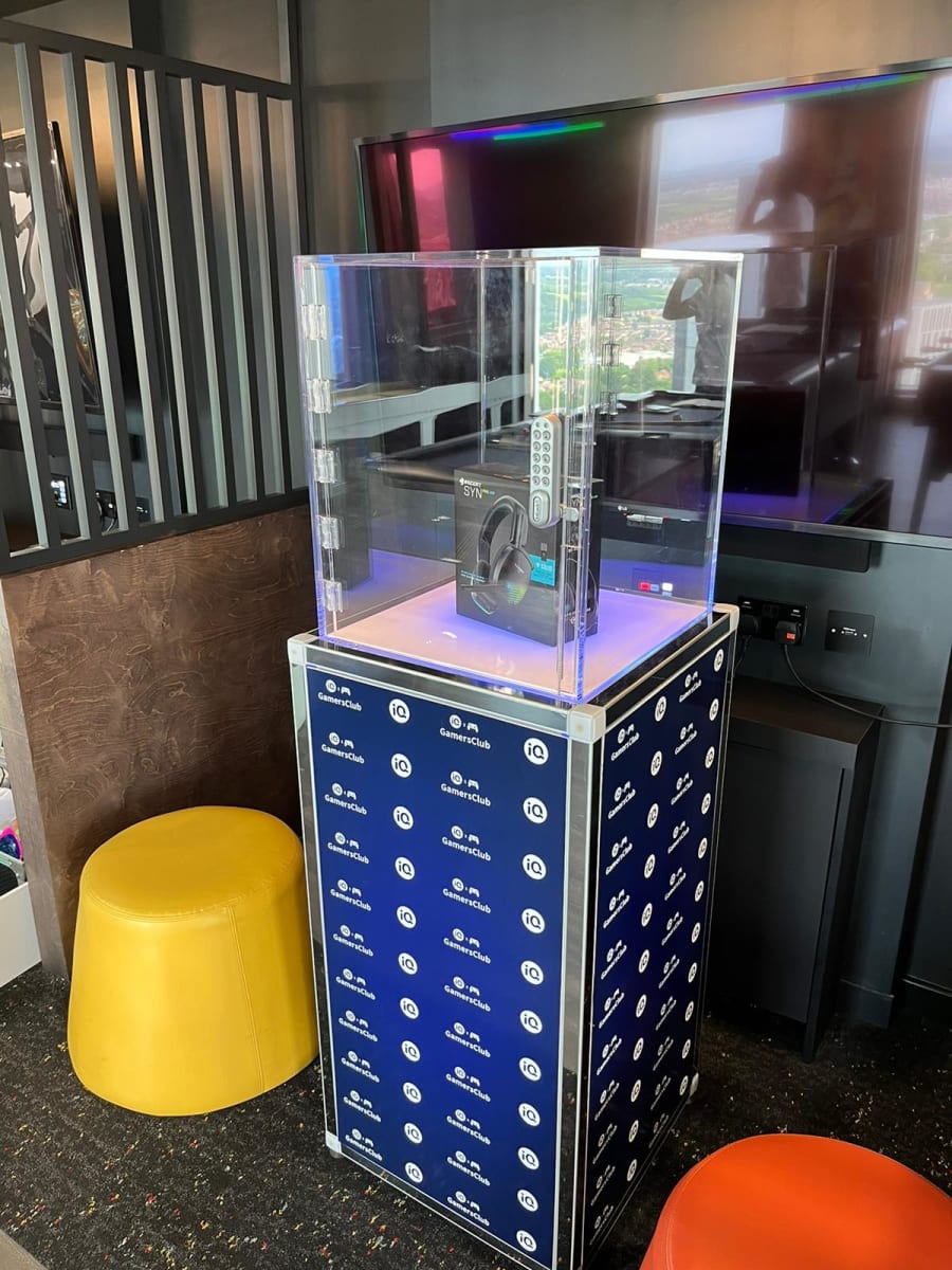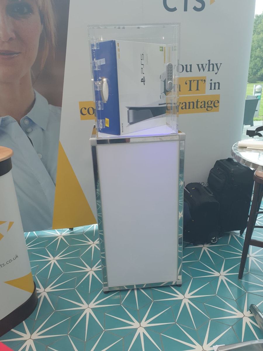 It might be a video gaming system, an expensive watch, or other high-end item. The box is seated on a tall stand. No, it’s not as simple as carrying the entire display away! Each participant must enter in the correct key code or password, that will open the box.