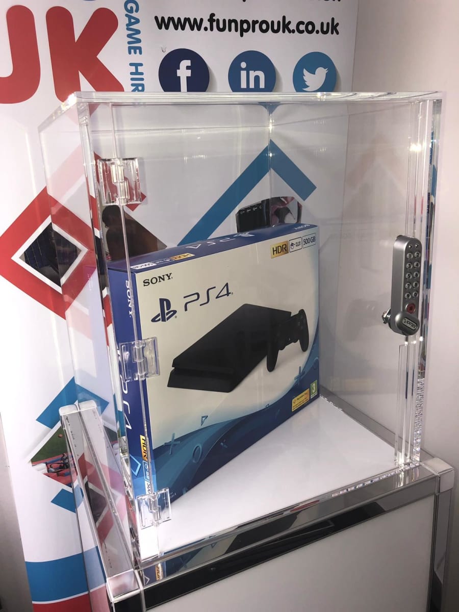 This is a simple game to play, but extremely hard to win. It involves a wonderful prize that is put on display inside a protective acrylic box.